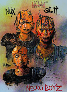 The art direction for the movie was a healthy mix of Road Warrior, Brom and Heavy Metal (comic or music, pick one! Or both!) Furiosa’s makeup and the “War Boys” were very reminiscent of Brom’s paintings for the Dark Age RPG. Oh and throw in a little dash of Phil Hale’s pale jumping guys in there as well.